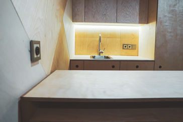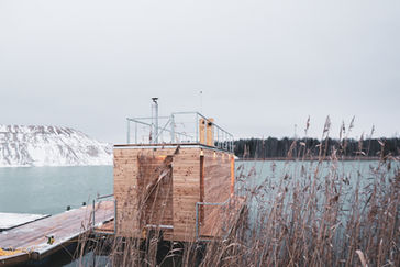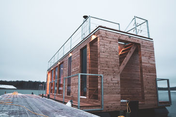Floating sauna / houseboat with a functional design. Exterior finishing, flooring and terraces are made of Siberian larch. Stability and functionality are the terms, which characterize this houseboat design. It is possible to build a bedroom instead of sauna.